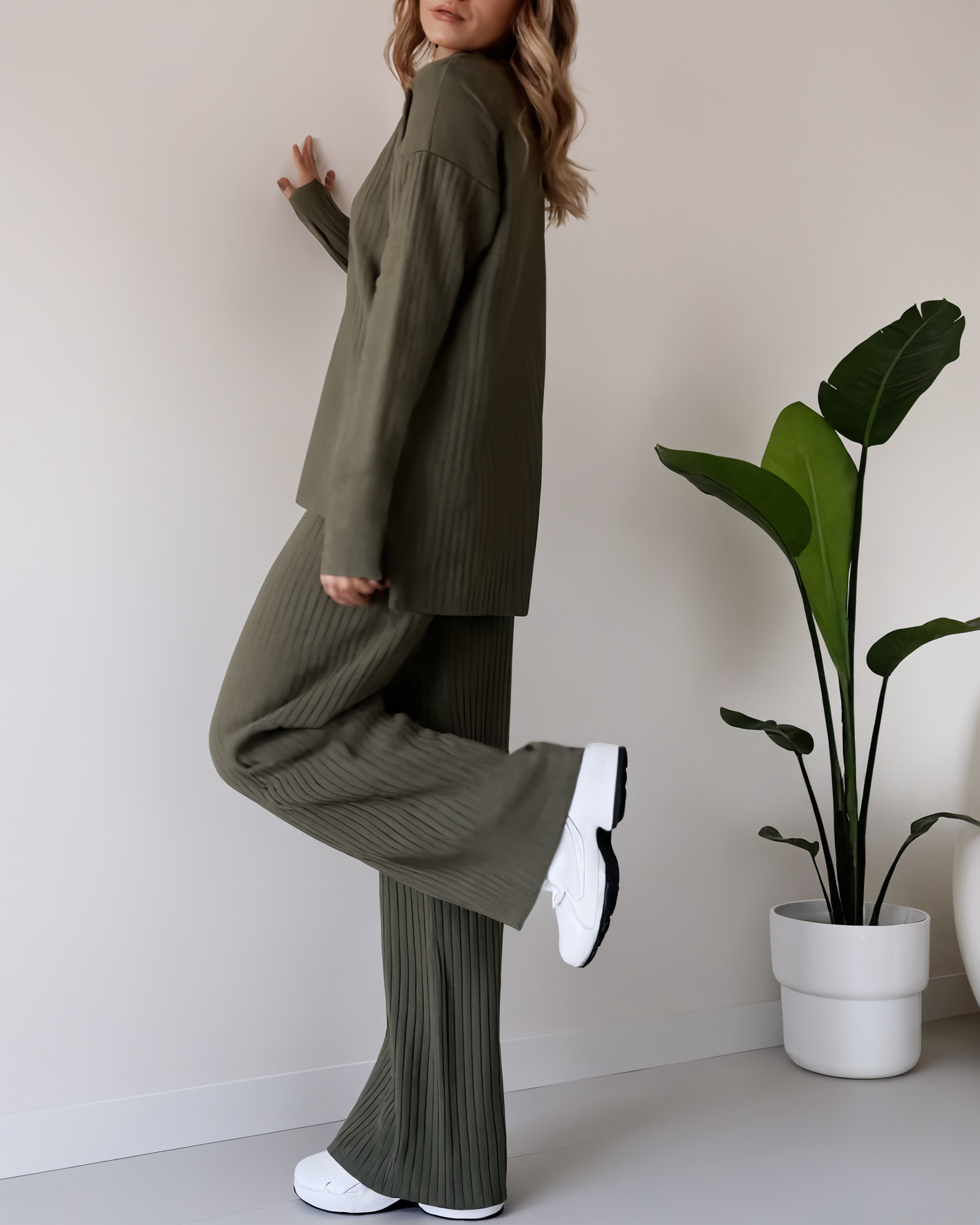 Dieses edle Rippstrick-Set kombiniert schlichte Eleganz mit ultimativer Bequemlichkeit. Der hochgeschlossene Pullover mit lässigem Schnitt und die weit geschnittene Hose schmeicheln der Figur und bieten ein angenehmes Tragegefühl.